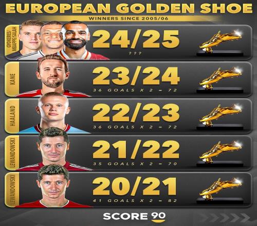 24/25赛季即将结束,姆巴佩本赛季西甲打入31球,以62分领跑欧洲金靴争夺,萨拉赫需在英超末轮上演大四喜才能反超。